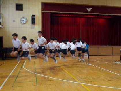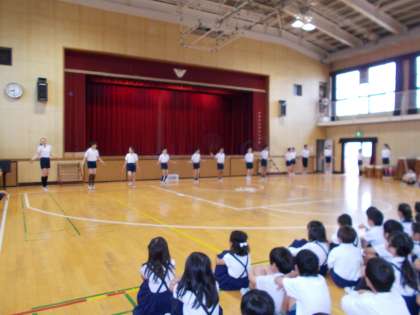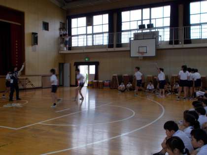 6年生は、短縄・長縄の技を見せてくれました。1番目は♪「365日の紙飛行機」♪に合わせて、短縄で交差跳びやあや跳び、二重跳び・ハヤブサを軽快に披露してくれました。2番目は、長縄での連続跳びです。目標は50回ということでした。見ている低学年が大きな声で数を読んでくれます。「98、99、100、101……110、111、112!」引っかかることなく連続112回跳ぶことができました。