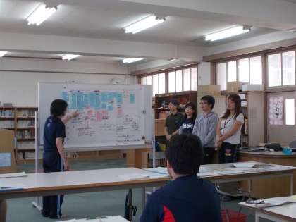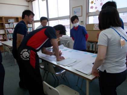4−1の授業を元に、研究会を開きました。成果や課題、今後の改善策をグループ討議をしながら検証しました。教育委員会から指導主事先生に講師として来ていただき、指導講評をしてもらい、今後に活かしていきます。