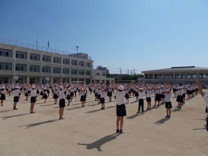 続いて、ラジオ体操を、運動委員会の5,6年生を見本に全員で実施しました。簡単なようで、実は難しいところがたくさんあるラジオ体操です。細かいところは、今後引き続き、体育集会で運動委員会の児童が教えてくれる予定です。