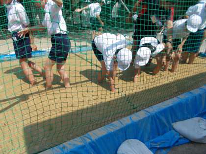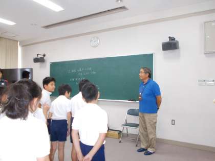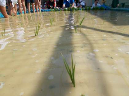 鷹合田にいよいよ苗を植え付けました。JAの方に来ていただき、田植えの方法を教わりました。苗床から少しずつ苗を受け取り、列に沿って等間隔で植えていきます。裸足になって、泥田の中におそるおそる入りながら、横1列になって田植えをしました。昔は、とても広い範囲の田んぼを中腰で植え続けるのですから、子どもたちは、「機械のなかった昔の人は、偉かったなあ」と感想をもちました。