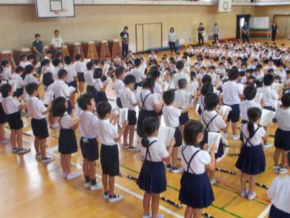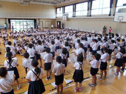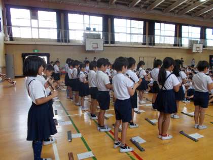 3年生になって初めて習ったリコーダー。2年生の終わり頃から、早く習いたくてウズウズしていたリコーダーですが、いざ吹いてみると空気がもれてきれいな音がならなかったり、指使いが難しかったり…。でも、ソ・ラ・シ・ド・レが吹けるようになり、息の調節やタンギングも上手になりました。今日は「さくら」という曲を演奏しました。