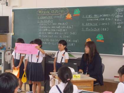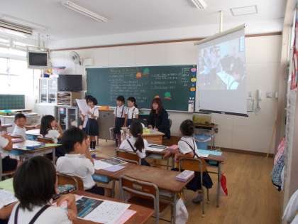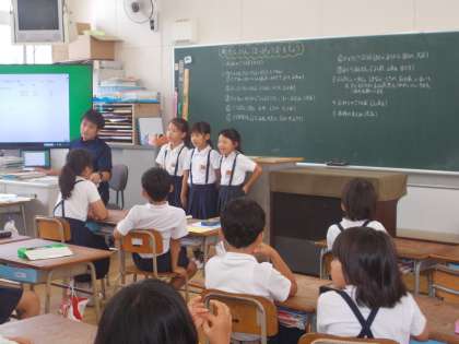 プール公開で、保護者の方にせっかく足を運んでいただくので、5月に実施した「町たんけん」で調べたことや見つけたことを、「発表会」として参観していただくことにしました。緊張しつつも、落ち着いて練習どおりに発表することができました。