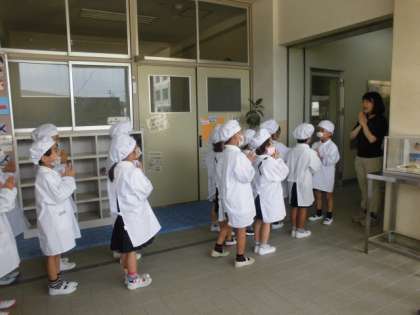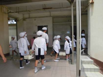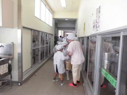 まずは、給食室前での「いただきます」と、運搬の様子です。
