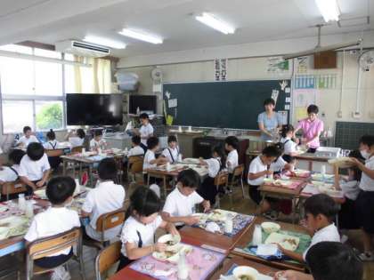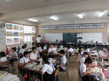 調理をしている給食室の暑さは、運動場どころではありません。エアコンなどない中で、400人分ほどの給食を作ってくださっています。