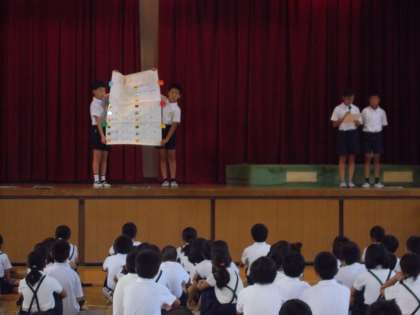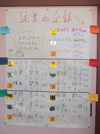 今日の児童集会で、1学期の読書の記録ランキングの紹介がありました。夏休みにも、いろいろな本を読んで「心の栄養」を増やしてほしいものです。