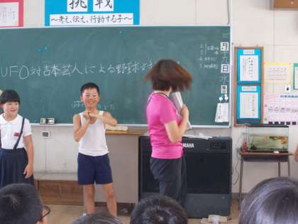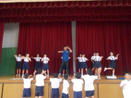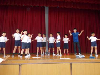 4−2は「津村先生とゆかいな仲間たち(1)」が「恋ダンス」、「津村先生とゆかいな仲間たち(2)」が「PPAP」を、サマーフェスティバルの「すごいキッズ!コーナー」で発表します。それに向けてのリハーサルを講堂の舞台で発表してくれました。本番が楽しみです。