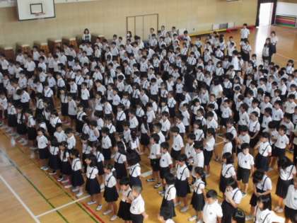 本日は、1学期の終業式でした。講堂に整列し、まずは、合田先生の指揮で、元気よく校歌を歌いました。