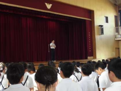 次に、校長先生から「1学期の学習の振り返りをしましょう。」「規則正しい生活を心がけましょう。」「夏休みにしかできないことに挑戦しよう。」というポイントで、夏休みを迎えるにあたってのお話を聞きました。