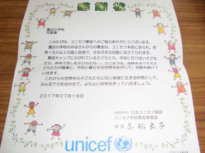 1学期に案内した「ユニセフ募金」の意義に賛同していただき、寄せられた募金を振り込んだところ、感謝状が届きましたので、お知らせさせていただきます。