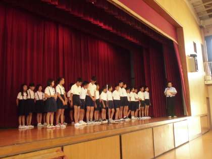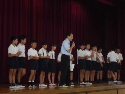 夏休みに水泳記録会や陸上競技大会に参加した児童が檀上に上がり、校長先生から表彰していただき、全校児童から拍手で讃えられました。また、児童絵画・版画展に選ばれた児童も、同じように表彰を受けました。