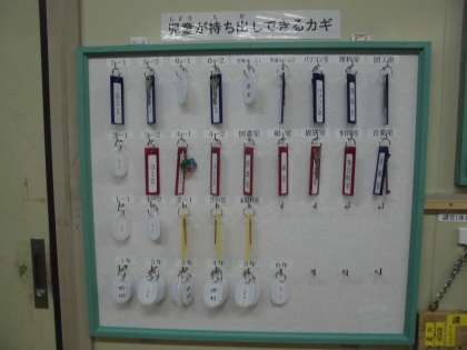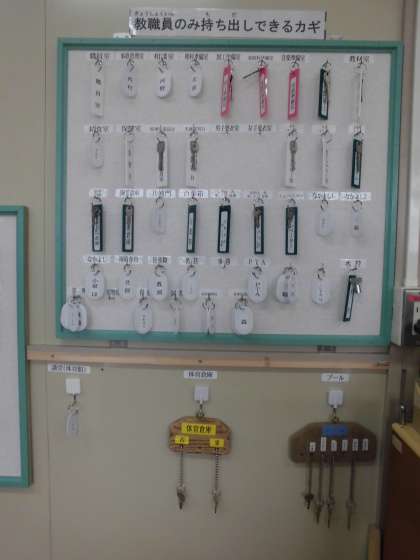 職員室内にあるカギの管理が今まで以上に分かりやすく、かつ安全管理が徹底できるようになりました。教室や、音楽室などの特別教室等の「児童が持ち出しできるカギ」を教室のある階ごとに配置したり、図工準備室などの「教職員のみが持ち出しできるカギ」に分けたりしました。いずれも、カギを持っていく時は、担任や使う教員の名札をかけて、その所在を明らかにします。管理作業員さんが中心となって製作してくださいました。