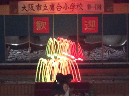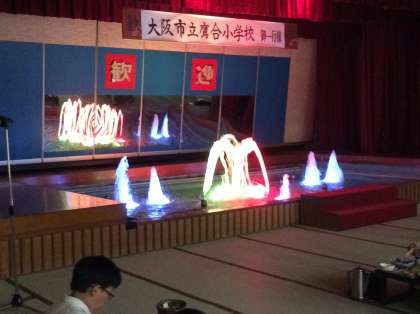 夕食は、大広間において、まず「鷹合小学校御一行様歓迎」の噴水ショーが行われたそうです。きれいですね。ところが、子ども達は、食事に夢中で全然見てなかったそうです。