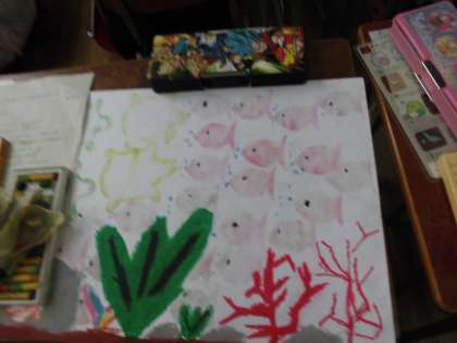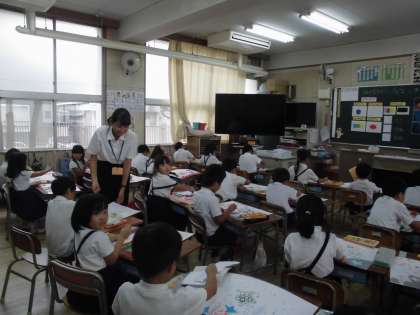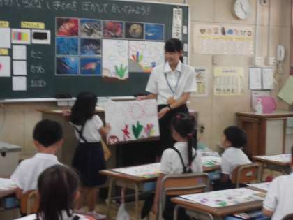 1年2組では、「うみのなかのいろいろないきものをぼかしえでかいてみよう」という学習をしました。パスの操作には「塗りこみ」「点描」「重ね塗り」「ぼかし」などがあります。幼稚園や保育園時代からもこれらの操作を使った学習をしてきています。今回は、特に「ぼかし」という操作を使って、海の中の生き物を描きこんでいきました。山口先生の準備した教材で、興味や意欲が高まり、集中して学習に取り組めていました。
