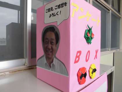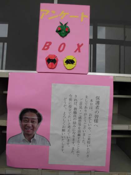 中島一彦校長先生が赴任されて、学習参観や作品展、学習発表会の後に、参観された保護者の方々のご意見やご感想を書いていただくアンケートBOXを設置してはどうか、と助言いただきました。前任校では、ずっと設置していて、温かい励ましの声や、次年度へ向けての参考になるご意見をいただき、次に役立つことができたそうです。