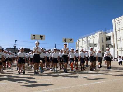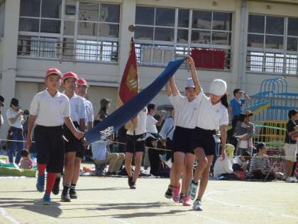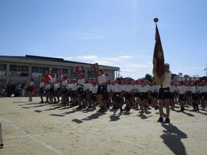 校旗、体育旗、赤白団長、赤白団旗が先導し、6年生から堂々の入場行進です。1年生にとっては、小学校初めての運動会。そして、6年生にとっては、小学校生活最後の運動会です。それぞれが、いろいろな思いを胸に、秋晴れの中の行進でした。