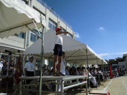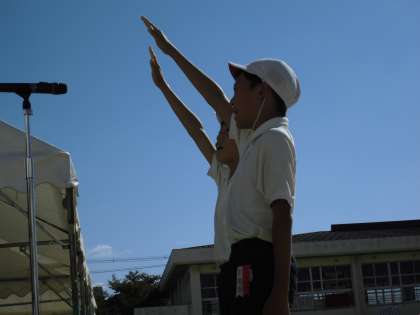 赤白両団長からの優勝杯・準優勝楯の返還があり、その後は児童代表による「誓いの言葉」です。自分たちで考えてきた言葉を、息ぴったりに宣言してくれました。そして、指揮者のタクトに合わせ、元気に「運動会の歌」を全員で歌いました。