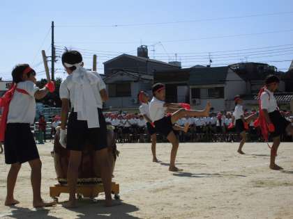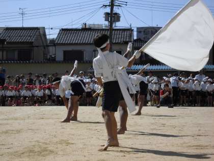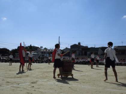 さあ、いよいよ開始です。まずは、応援合戦です。両団長が中心になって、応援団をまとめ、運動会を盛り上げるために、一生懸命頑張ってきました。赤組団長が、声を限りに「燃え上がる炎の色は何色だああああっ!」とコールすると、「赤!!!!」と答える赤組全員。白組団長の「今、着ている体操服の色は何色だああああっ!に「白!!!」と答える白組全員。三々七拍子や二三二拍子など、太鼓のリズムに合わせて、応援団と児童全員での掛け合いが続きます。低学年は団長と同じ振りをして応援していました。