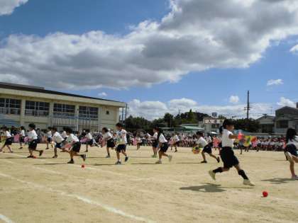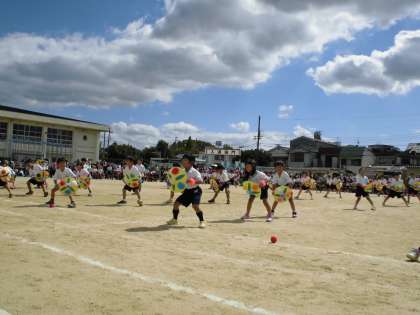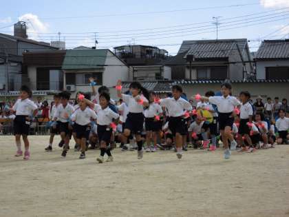 1年生は、カラフルなかわいい花笠を持っての「花笠音頭」です。「ヤッショー、マカショ!」の掛け声と、腰の入った踊りがかわいらしかったです。敬老席から、目を細められた笑顔や合いの手、拍手が沸き起こりました。