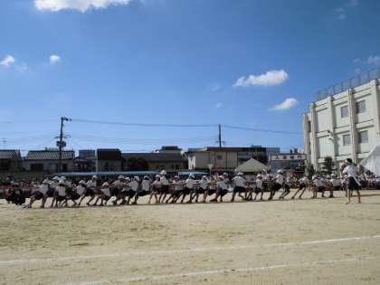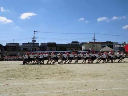 3年生の「綱引き」の様子です。旗が倒れかけたら挽回し、手に汗握る展開でした。