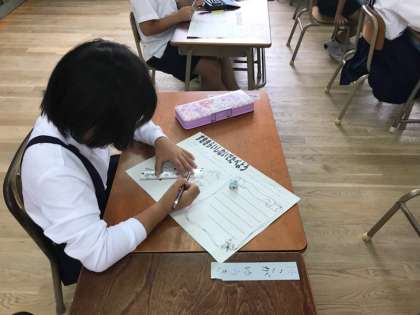 本日の2時間目、3時間目は、それぞれ1−1、1−2で、栄養士の石見先生から「すききらいなく食べよう」という内容で教えていただきました。紙芝居で、すききらいの多い「ほろちゃん」のお話を読んでもらいました。すききらいなく食べることで、体が作られ、元気が出て、病気にもかかりにくくなることを学びました。