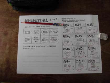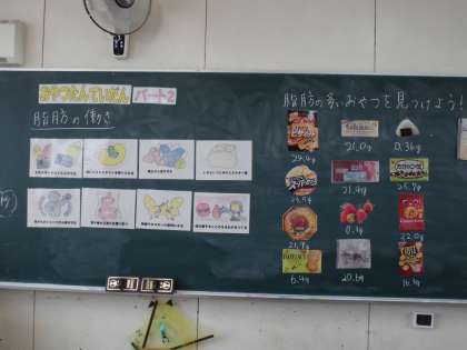 本日の2時間目、3時間目はそれぞれ5−1、5−2で栄養士の石見先生から「おやつたんていだん・脂肪の働き」という学習をしました。脂肪というと、「河野の敵」でしかない気がするのですが、体にとって必要な栄養素の一つです。体にとって重要な働きがいっぱいあります。しかし、取り過ぎはよくありません。日頃のおやつの中に結構潜んでいることが分かりました。「たけのこの里」や「ポテチ系」は多いですね(-_-;)
