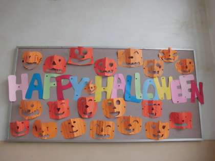 3年の学年掲示板に貼りました。教室や廊下もハロウィンランドになってます(^_^;)