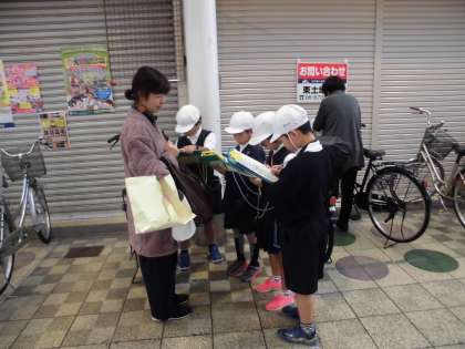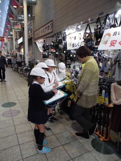 スーパーの見学で、一度経験しているインタビューですが、ドキドキしていた様子です。駒川商店街のお店の方々は、子ども達をあたたかく迎えてくださって、親切に答えてくださっていました。お客さんへのインタビューでは、知っている友達のお母さんを見つけて、何やらホッとした様子で質問していました(笑)