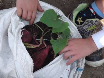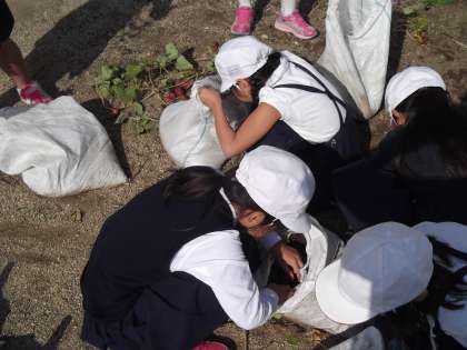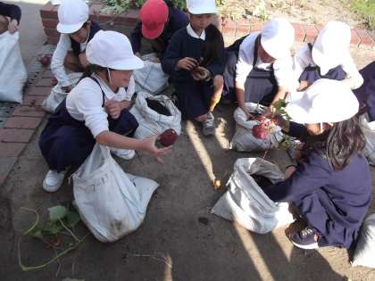 2年生が、一人一袋で育ててきたサツマイモ。いよいよ、楽しみにしていた収穫の時がやってきました。土嚢袋の中で、すくすく育っていたはず…(^_^;)