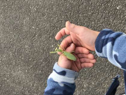 これは、2年の男の子が捕まえたカマキリです。はじめはカマを振り上げられて、びびっていましたが(笑)、安全な持ち方を教えたら、あっという間に慣れていました。あるパパから、「お腹を水につけたら、針金みたいな虫が出てくるで」と教えてもらってました。このパパは、ママのパジャマの裾を結んだり、かばんに国語辞典を入れたりするイタズラをよくする、ということをママから聞きました。おちゃめですね(笑)