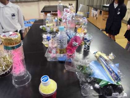 先週から作りだしていた「クリスタルファンタジー」が完成し、いよいよ理科室で鑑賞することになりました。暗幕で暗くすることができる部屋は理科室のみです。「月の満ち欠け」の学習をする時の光源ライトと、林間学習で使う懐中電灯、そして赤・青・黄・緑の色水を準備して、後は子どもたちの作品の組み合わせのセンス次第です(^O^)