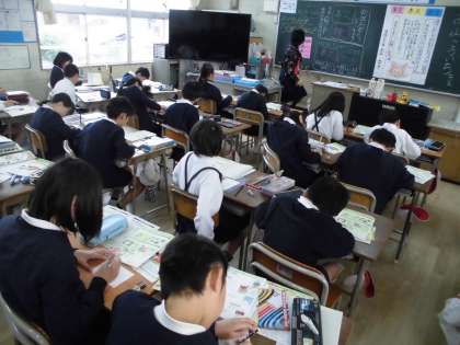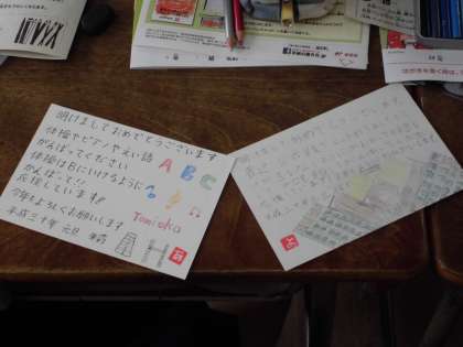 もう一つ、うれしいことに一人一人に名前の最初の文字で「消しゴム判子」を作成してプレゼントしてくださいました。はがきの最後に記名した後に、朱肉で押すととてもいい感じです。この判子は、今後習字の学習で、記名の部分に使うと書いた習字の格が上がる感じがします。(笑)とてもありがたいプレゼントです。