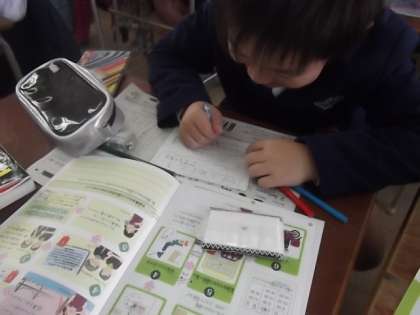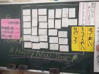 2組も「名前のひらがな判子」をいただきました。名前の横に押してできあがりです。「送って楽しい、もらってうれしい年賀状」ということで、できあがった年賀状を黒板に貼って、みんなで鑑賞しました。ポストへの投函は12月15日〜25日までの間にしましょう、とのことでした(^O^)