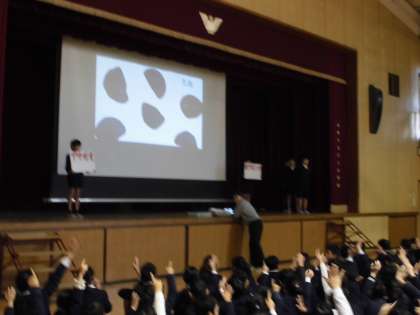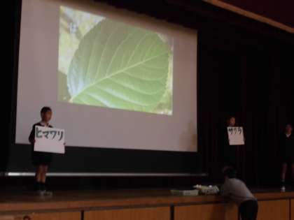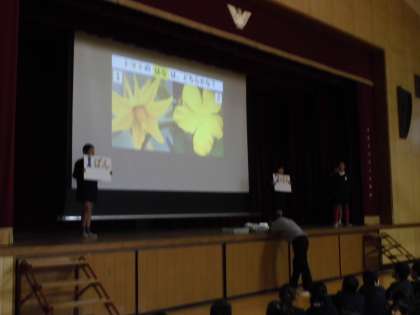 仕事の内容を紹介した後は、植物映像クイズを出してくれました。初めは、アサガオの種を当てる簡単なものでしたが、その後は「八重のチューリップ」と「バラ」の映像を見て、「チューリップはどっち?」(見事に落とし穴にはまりました(笑))や、「ひまわり」と「桜」の葉っぱの映像から「ひまわりの葉っぱはどっち?」や「トマトと「カボチャ」の花の映像から「トマトの花はどっち?」という問題に、挙手で答えました。