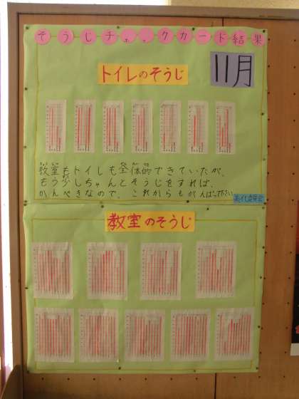 先週、美化委員会が「清掃チェック」をしてくれた結果を、グラフにしてまとめてくれました。どの学級も、しっかりと清掃に取り組んでいたようです。