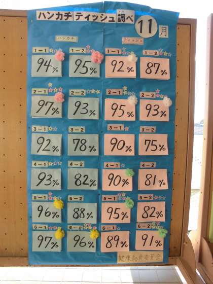 また、保健給食委員会は「11月のハンカチはなかみ調べ」の結果をまとめてくれました。中学年の所持率が低いですね。これから風邪が流行り出します。清潔なハンカチを持つように心がけましょう。