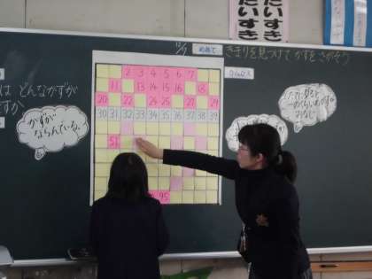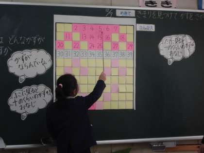 今まで学習してきたことを思い出し、「一の位」の数字の並び方や「十の位」の数字の並び方に着目して、並び方のきまりを見つけ、どの子も自信を持って発表し、「わかった!」という喜びの笑顔でした。