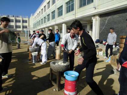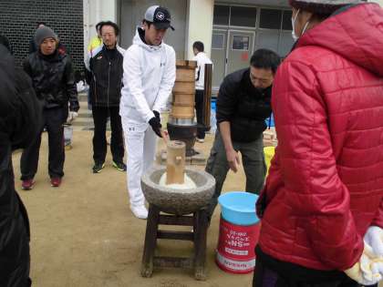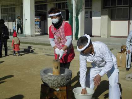 蒸した餅米を臼に入れ、杵でコネコネこねる所でほぼ餅になります。そして、「ヨイショッ!」「はっ!」と威勢のいいかけ声と共に、お餅つきとなるのですが、ここは「あいどり」の方の手腕にかかってきますね。上手に餅を返し、まんべんなくつきあげていく導き手です。この道のプロ(光)というご様子の方があいどりをされていると「技」やなあ〜、と感じました。これから、その道を目指す、というご様子のお父さんがあいどりをされているところは、まわりのお父さんたちからの温かい(?)励ましの声に思わず吹き出しました(笑)
