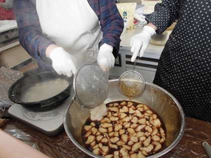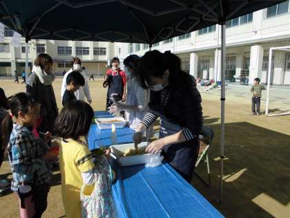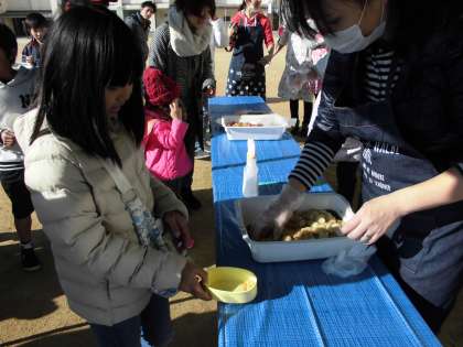 子ども達、おまちかねの「ふるまい餅」です。つきたてのお餅は、いくらでもスルスル入りますよね。きな粉と醤油味です。子ども達の食欲に負けないように、家庭科室では、お母さんたち大ハッスルです!