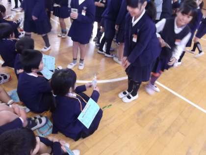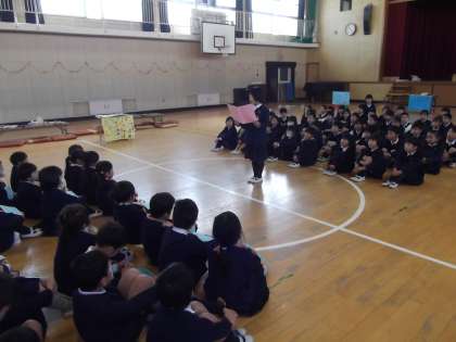 閉会式では、1年生に手作りのおもちゃ「ぴょんぴょんがえる」をプレゼントしました。