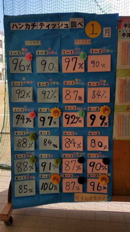 2月6日(火)の健康・給食委員会で1月のハンカチ・ティッシュ調べの集計を行い、保健室前に掲示をしました。平均の所持率がハンカチは90%、ティッシュが89%という結果でした。