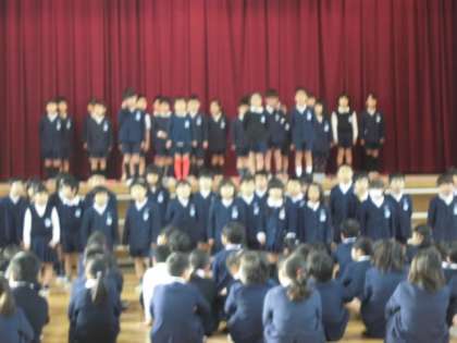 今日の児童集会は1年生の学年発表を行いました。上級生の前で、ふれあいお楽しみ会で学んだ、けん玉やこままわし、そして1年間練習したなわとびを披露しました。なわとびの最後はにゃんこスターで締めくくり。上級生からは拍手喝采でした。