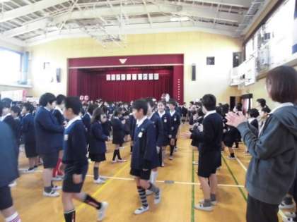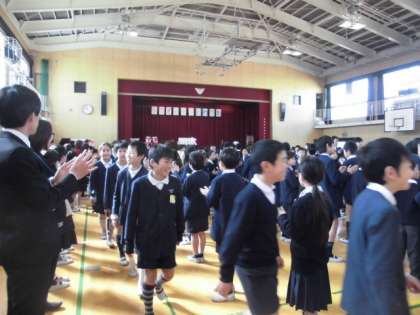 最後は、在校生の間を、くねくねと通りぬけながら、花のトンネルを通って退場しました。BGMは嵐「サクラ咲ケ」。この曲は、祝う会の退場曲にピッタリで、河野が担当になったら必ず使っていたのですが、児童会担当の森田先生が、今年もこれを使用してくれて、一人ほくそ笑んでおりました(笑)「振り向くな、後ろには明日はないから。前へ!前へ!」
