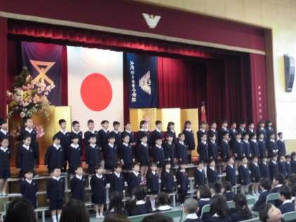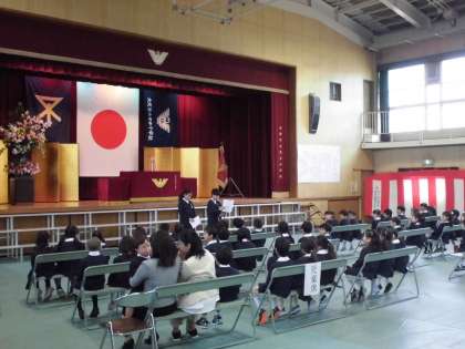 在校生を代表して新6年生から「おむかえのことば」がありました。学校は楽しい、たくさんの楽しい行事があること、おいしい給食があること、いろいろな学習があること、何でも優しく教えるから、安心してほしいこと、などが伝えられました。