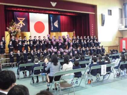 続いて、新2年生からの「おいわいの発表」がありました。3月から、この日のためにずっと練習してきた新2年生。元気に明るく楽しく「校歌」を歌ったり、「パワー注入!」とパフォーマンスを見せてくれたりしました。新2年生も、1年前は入学式でドキドキの様相だったのに、1年たつとこんなにもしっかりとした発表ができるように成長するのだな、と感心しました。