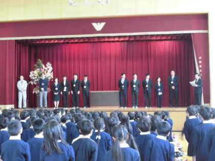 校長先生から、(1)新しいクラスで友達を作ろう (2)自分の目標を決めよう (3)クラスの目標を決めよう というお話がありました。そのあと、新しく鷹合小学校に着任された教職員の紹介が校長先生からありました。