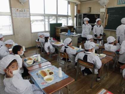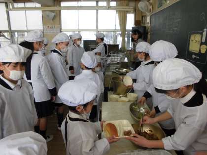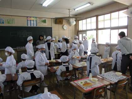 1年生は、給食の様子をみていただきます。初めての学校給食。まずは、エプロンに着替えます。かわいいコックさんがたくさん(^O^) 今日は6年生のお兄さん、お姉さんが運搬や配膳を手伝ってくれました。しばらくの間は、6年生がサポートしてくれて、だんだん自分たちだけでできるようになる予定です。4月20日の給食参観では、自分たちだけで準備する様子を見ていただけるようにがんばります。