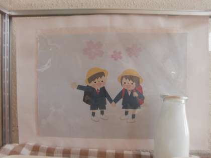 4月です。献立見本ケースの絵もピカピカの1年生です(^O^)