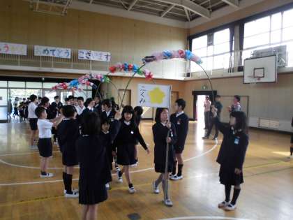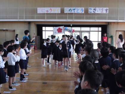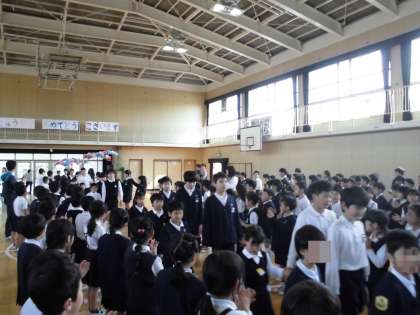 児童会主催で、新1年生の入学を祝う「入学おめでとう集会」が行われました。児童会代表は昨年度末より少し練習はしていましたが、全員のよびかけは本日の朝の15分ほどだけです。でも、隊形移動や歌、よびかけの練習は、ほぼ一発合格!気合が入っていました。代表委員が先導し、6年生に手を引かれて、1年生達がニコニコ笑顔で入場してきました。