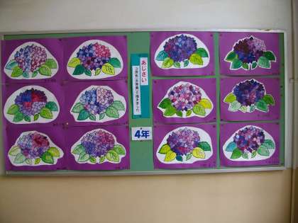 雨も降らないと大変ですが、運動場が使えない日が続くと子どもたちもかわいそうです。4年生の図工の作品です。色や水の加減を考えて描いたあじさいです。