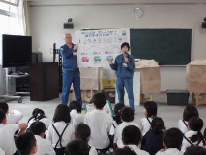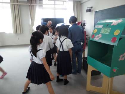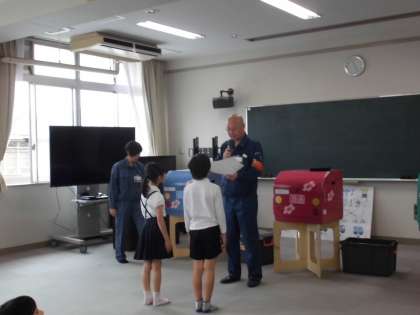 次の時間は、多目的室で「ごみの分別」「分別したごみを出すときのルール」などについてクイズも交えながら学びました。平成3年には217万トン(京セラドーム2個半)のゴミを処理していたそうですが、平成27年には84万トンにまで減らすことができたそうです。「3つのR]リデュース・リユース・リサイクルを徹底したことが、功を奏した要因だった、と教えていただきました。最後には、今日の学習で学んだことの「認定証」をクラスごとにいただきました。
